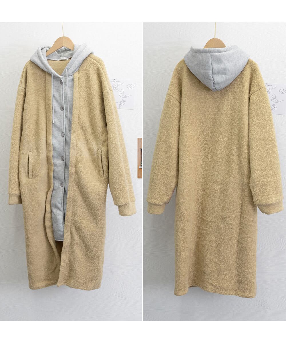 まるで中にパーカーを着ているかのようなレイヤードスタイルのボアロングコート