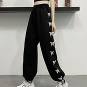 一見シンプルながらもサイドにバタフライプリントをあしらったことで一気に華やかになるフェミニンさのあるカジュアルボトムス