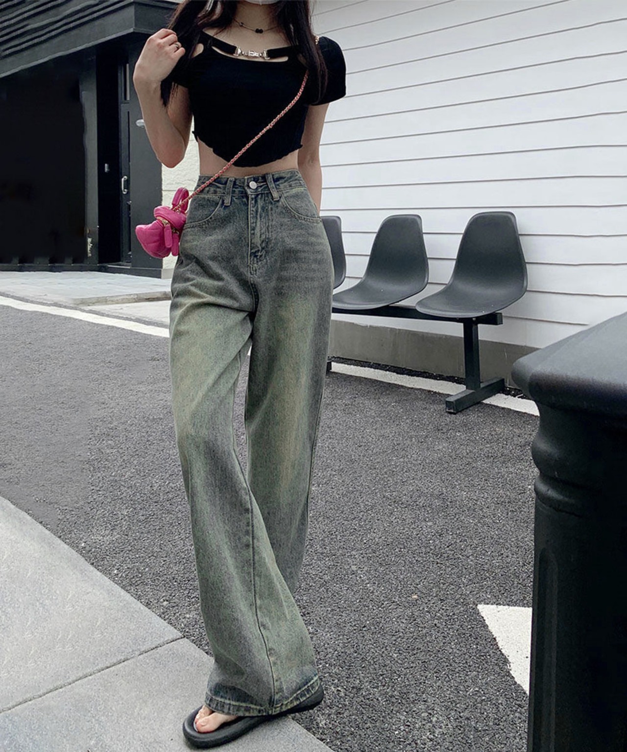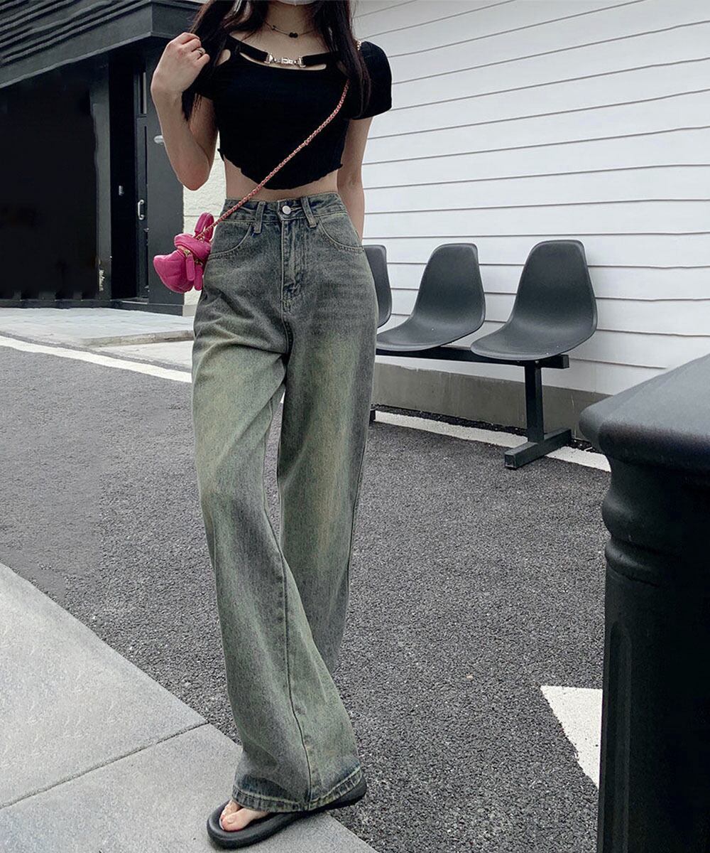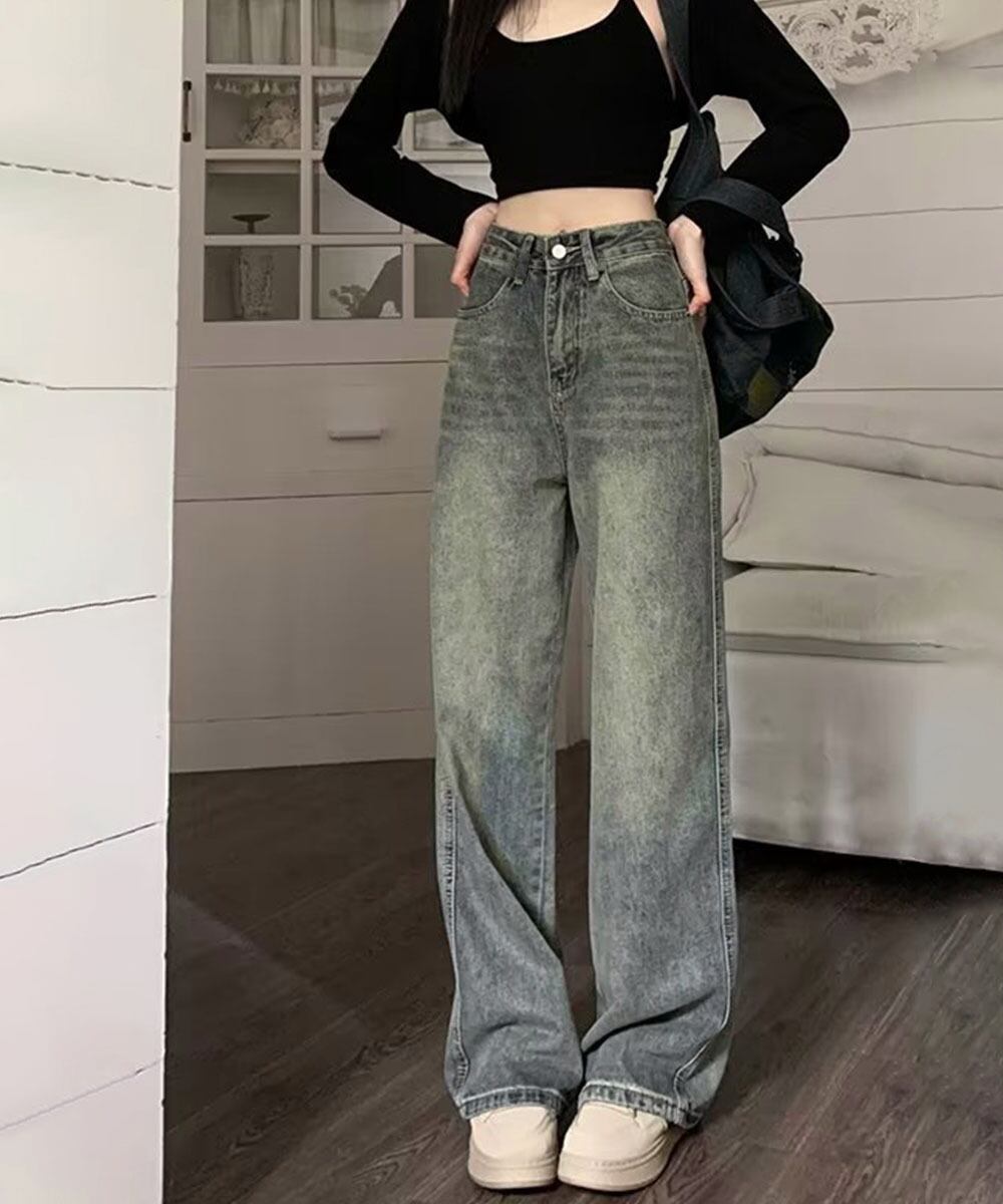 レトロ風ジーンズ ハイウエスト ウォッシュデニム 美脚脚長 セミワイドパンツ フルレングス 着やせジーパン 体型カバー