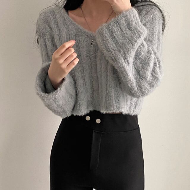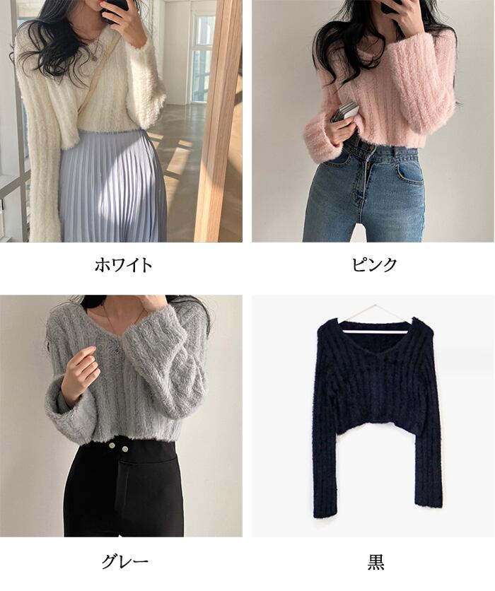 モヘア調 ミニ丈 ショート丈 Vネック トップス プルオーバー ニット セーター