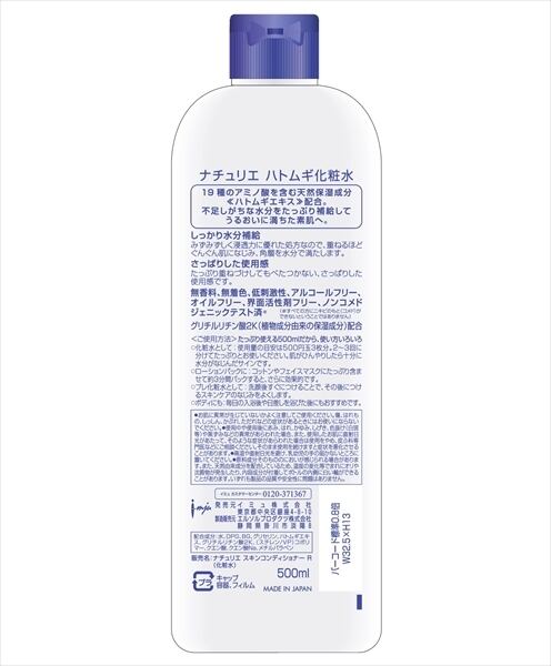 みずみずしくてべたつかない使用感はそのままに、ハトムギエキス20%増量により保湿力アップ。さらにお肌にやさしい、処方(アルコールフリー、無香料・無着色・低刺激性・オイルフリー・界面活性剤フリー)。19種のアミノ酸を含む天然保湿成分≪ハトムギエキス≫配合化粧水。たっぷり使える500mlだから、使い方いろいろ。基本は化粧水として、使用量の目安は500円玉3枚分です。 2~3回に分けてたっぷりお使いください。肌がひんやりしたら十分に水分がなじんだサインです。 その他、ローションパック・プレ化粧水・ボディ用としてもお使いいただけます。