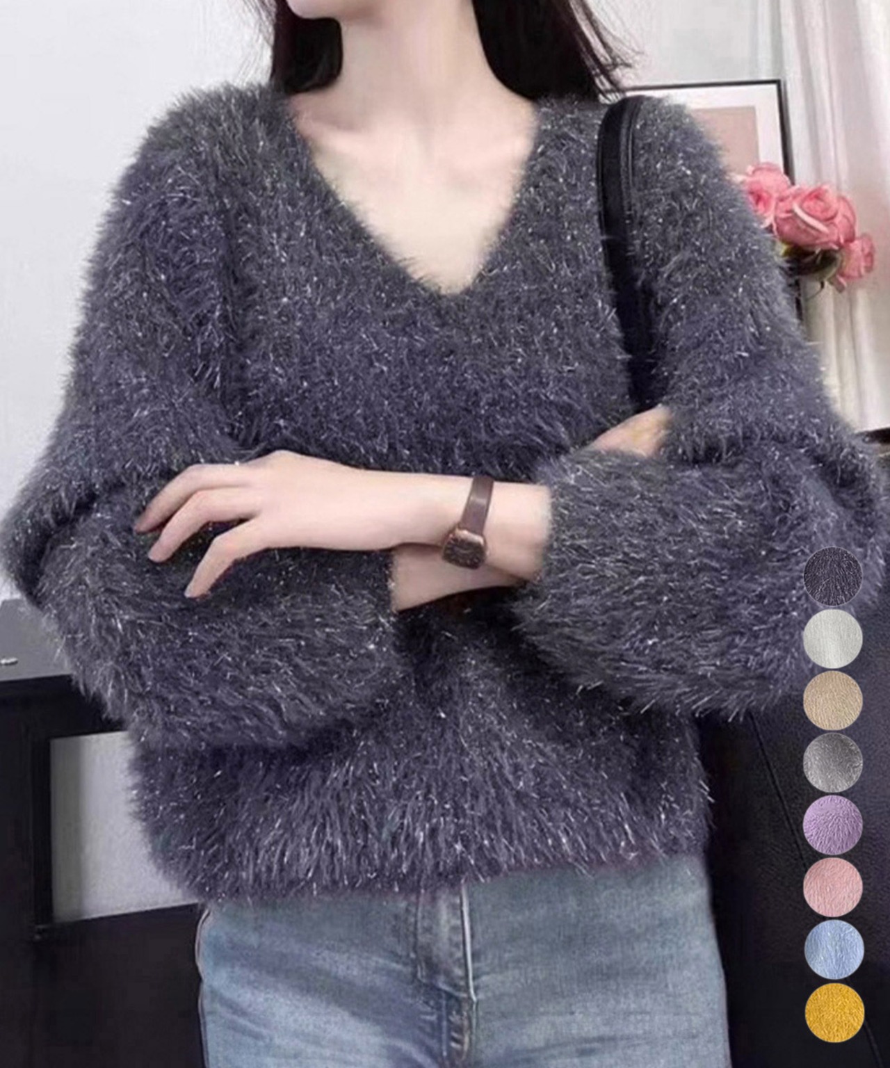 レディース ふわふわ モヘアニットプルオーバー 大人可愛いシャギーセーター 韓国風きらきらトップス キレイめニット 無地