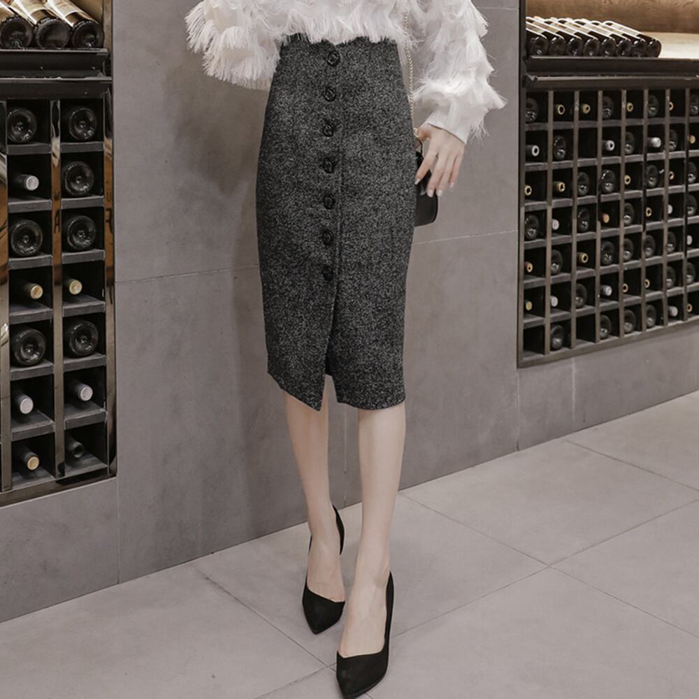 フロントボタン全開式のハイウエストミモレ丈ツイードスカート