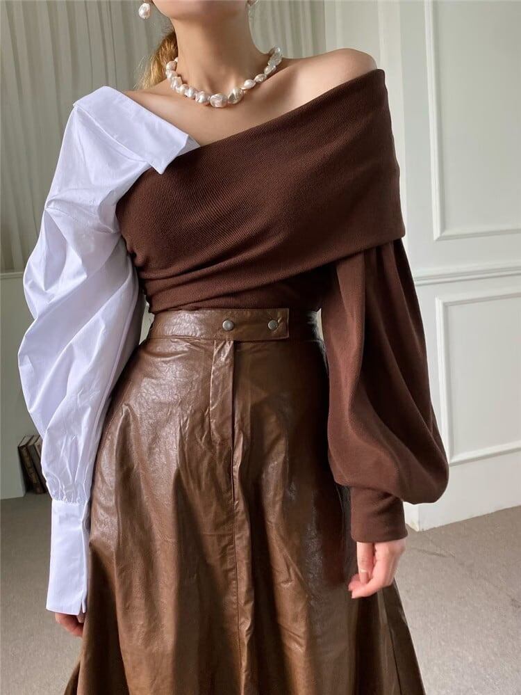 スリム カラーマッチング ニット 縫付 トップス デザインセンス 新作 オフショルダー