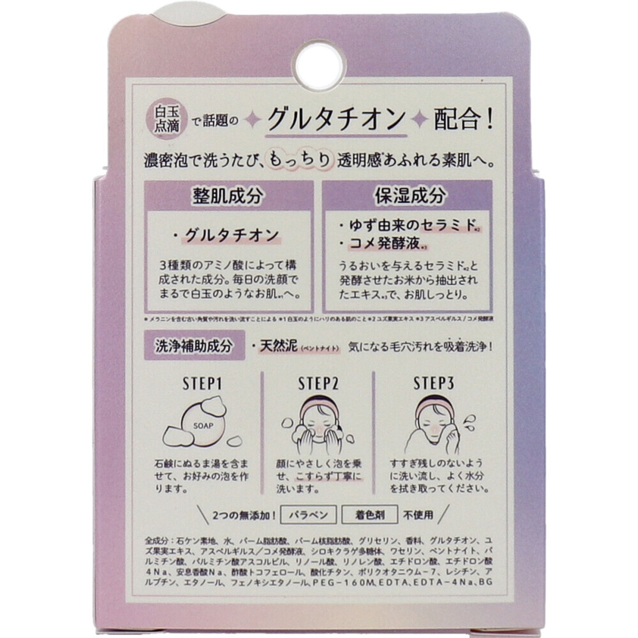 ・グルタチオン:3種類のアミノ酸によって構成された成分。毎日の洗顔でまるで白玉のようなお肌へ。