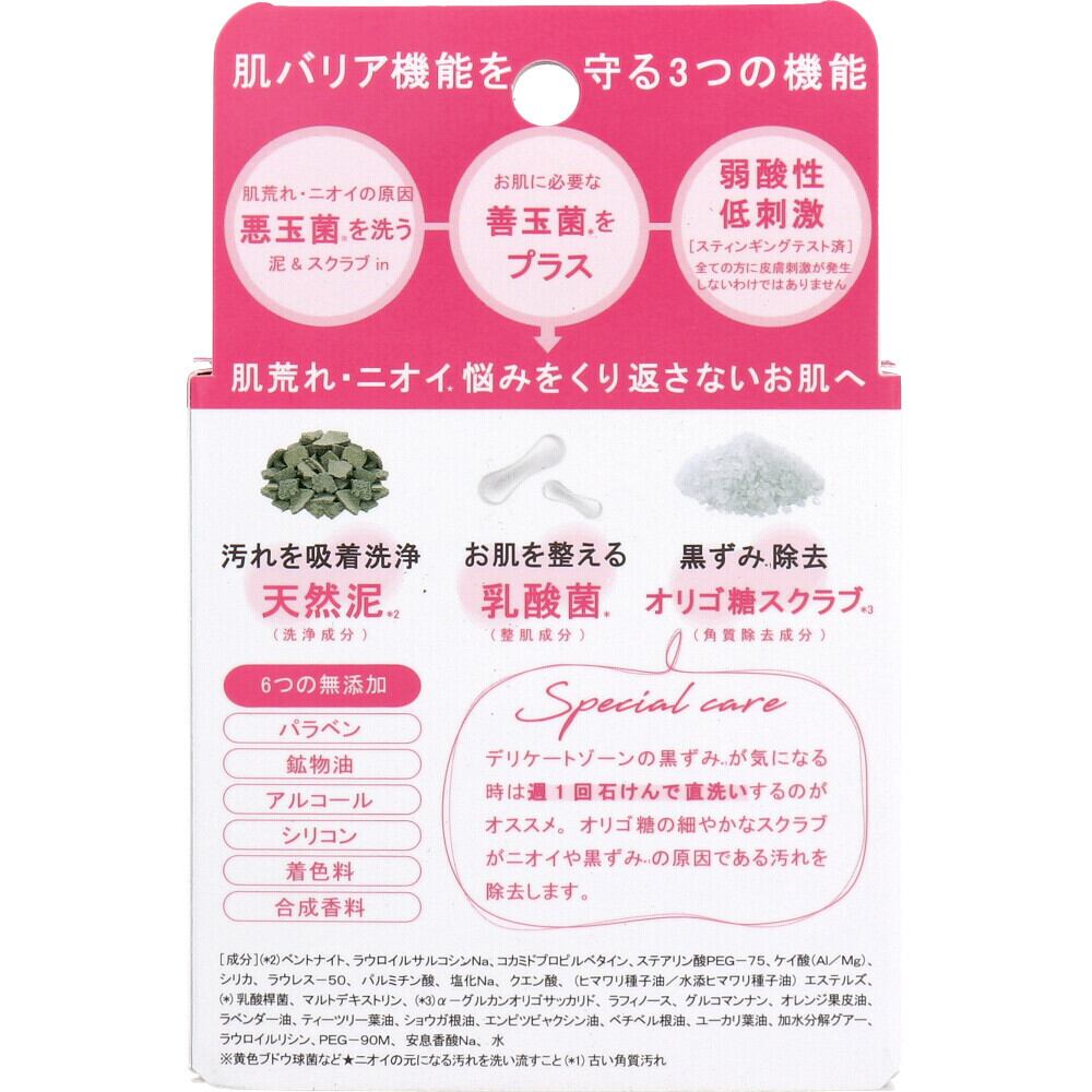 スペシャルケア:デリケートゾーンの黒ずみ※4が気になる時は週1回石けんで直洗いするのがオススメ。オリゴ糖の細やかなスクラブがニオイや黒ずみ※4の原因である汚れを除去します。